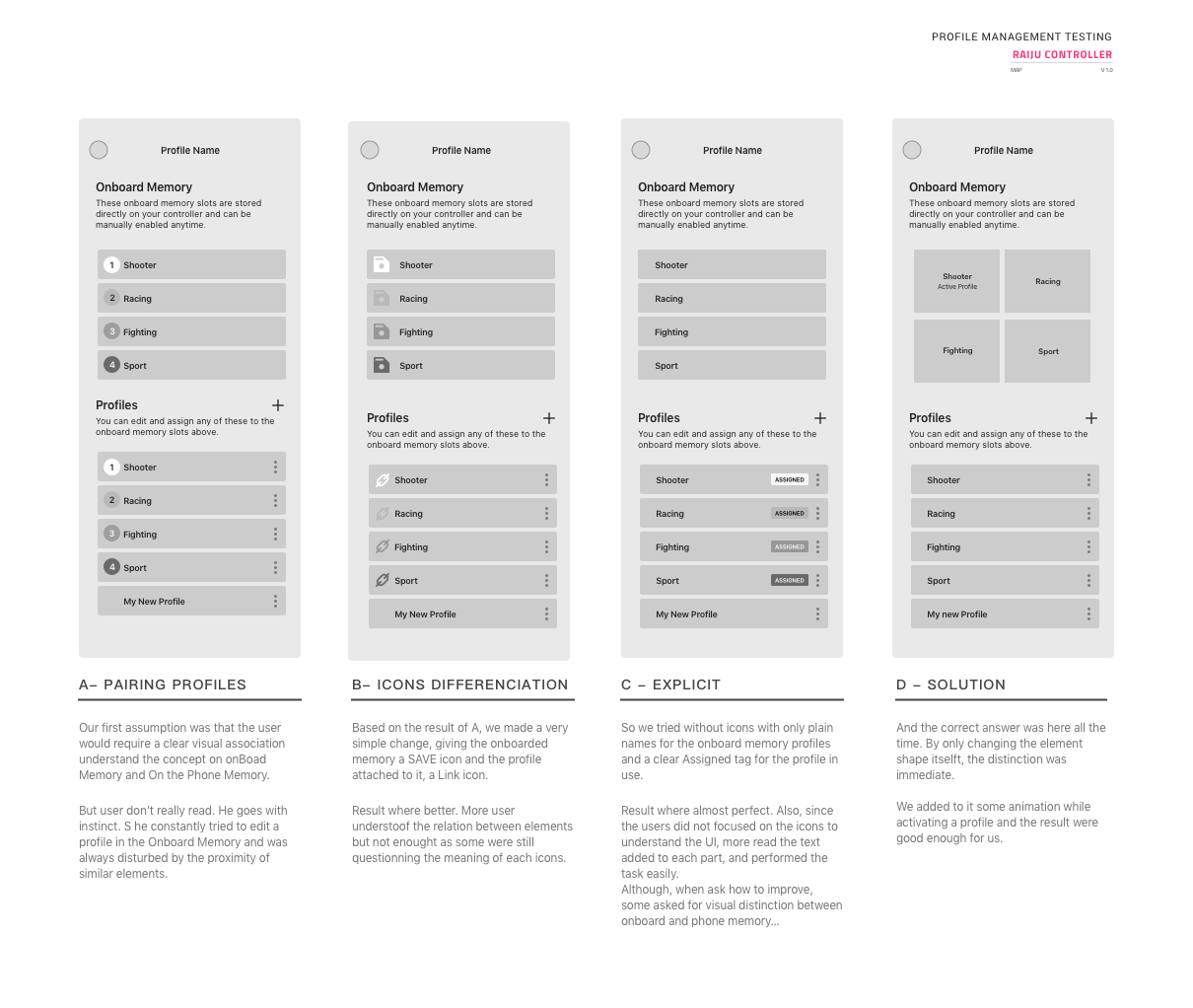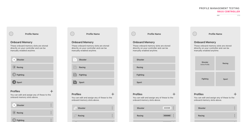 Since the number of memory slots in the controller was limited, but the number of profiles in the Cloud wasn't, we spent most of our testing effort ensuring users understood when a profile was either Assigned, Saved Locally, or Saved in the Cloud.