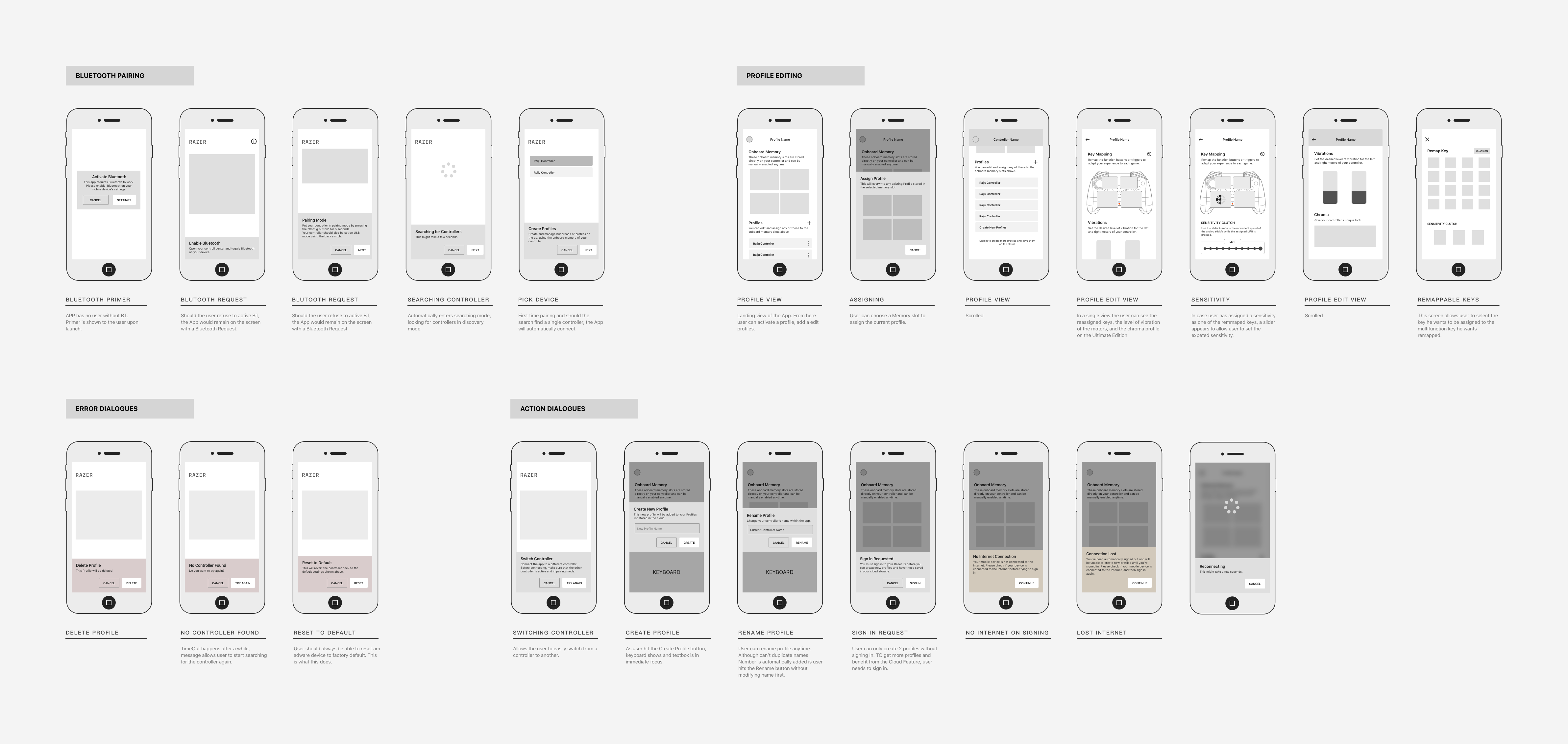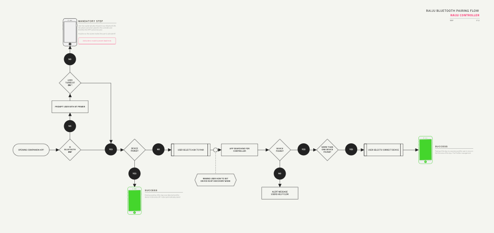 First, we had to understand in detail how the firmware and the devices were going to communicate. Especially when it comes to Bluetooth and BLE connection, restrictions are many. We have to assess how much Lag we might be dealing withâidentifying pinpoints where the user might face trouble and get stuck in the pairing process.